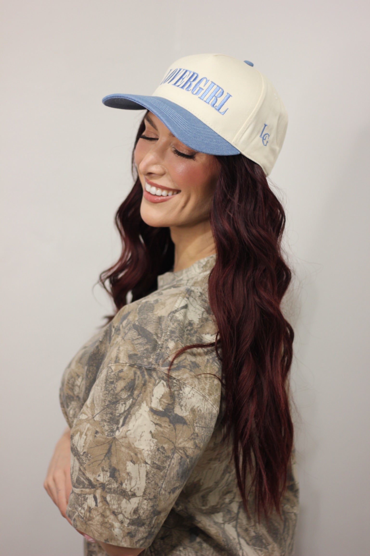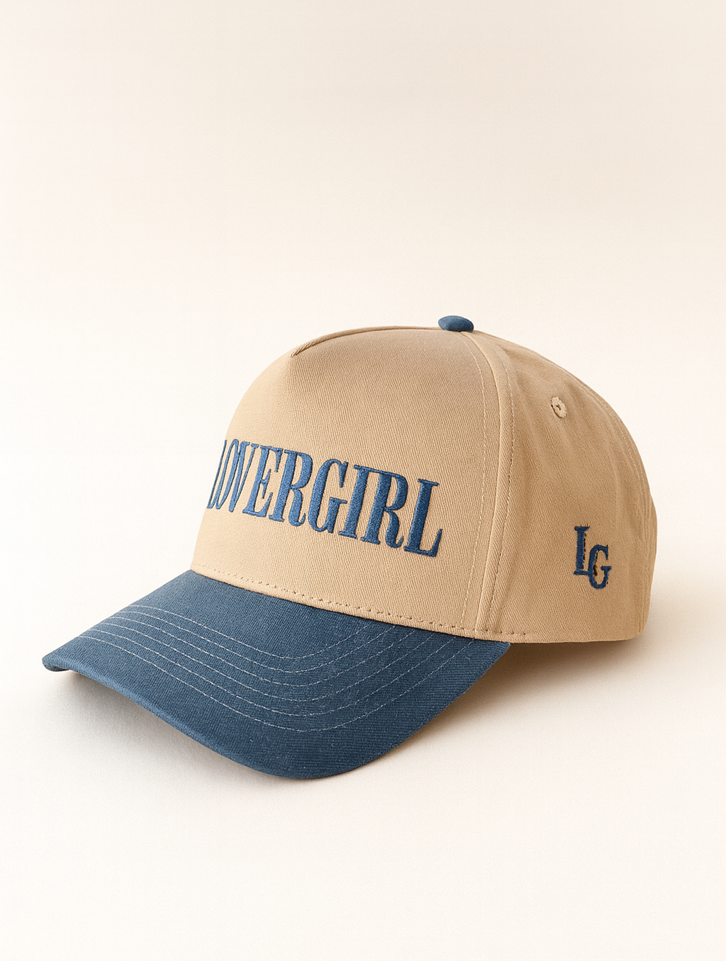Light blue and off white two tone 5 mid panel, adjustable snap back with side logo