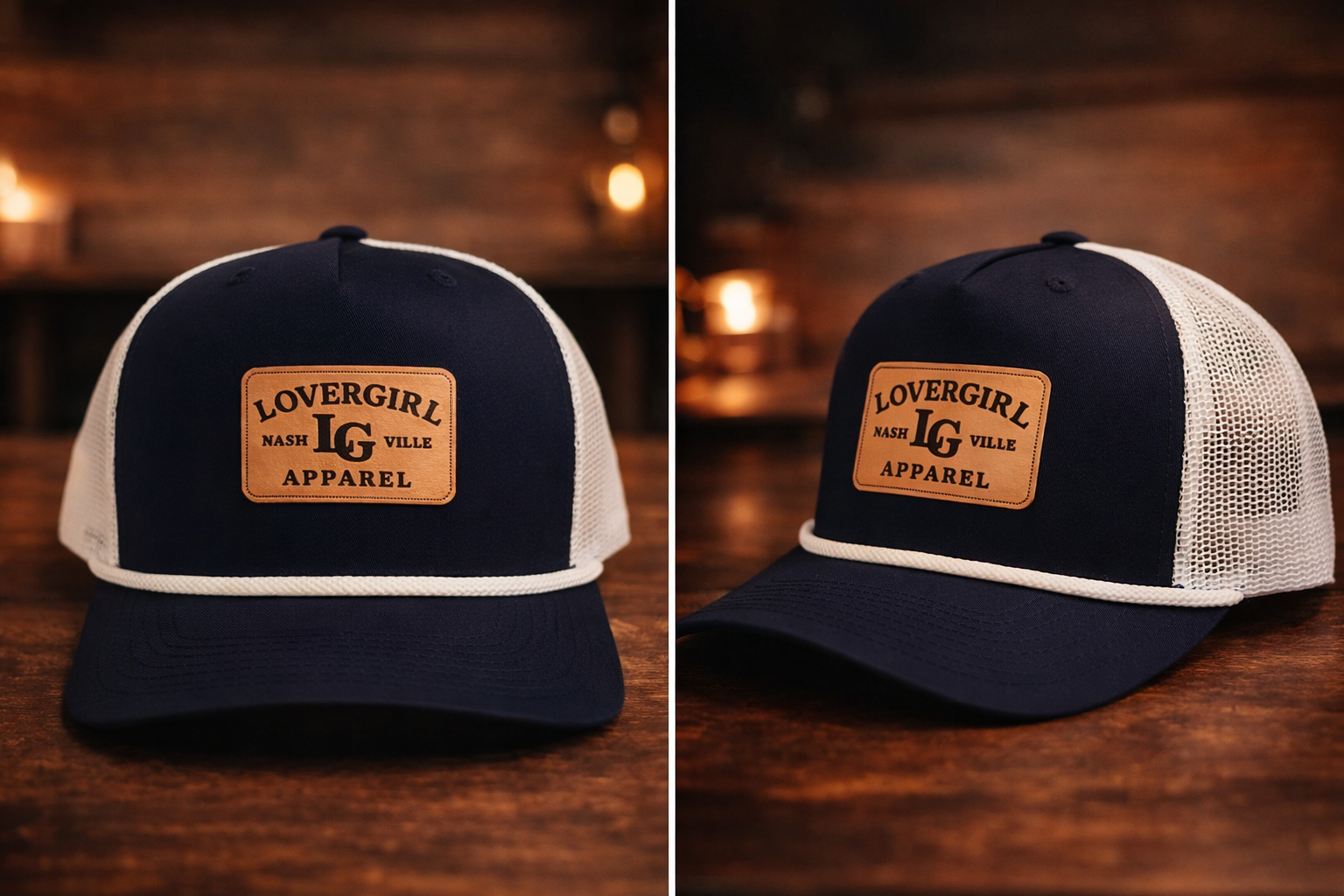 5 panel mid profile structured trucker navy and white with white rope. Adjustable snap back